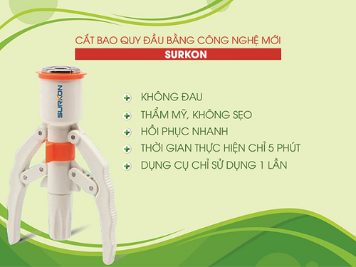 Cắt bao quy đầu bằng công nghệ cao Surkon Surkon là phương pháp sử dụng một dụng cụ y tế sử dụng 1 lần để cắt bao quy đầu. Loại máy này được đánh giá là bước đột phá trong y học về việc cắt bao quy đầu. Máy Surkon tích hợp cắt và khâu bao quy đầu trong 1 lần bằng phương pháp Stapler, hay còn được gọi là máy dập ghim.